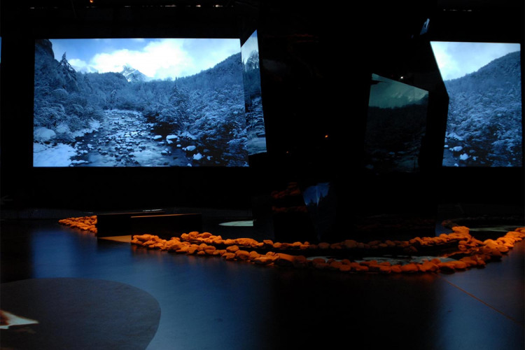 The area "Aragón: Agua y Vida" has the traditional commitment of this community as a thread with the sustainable use of water and is made up of a selection of representative pieces of Aragonese art, photographs and audiovisual. But the main space of the pavilion is an immense room in which the spectacular audiovisual “Aragón: Water and Future”, by the Aragonese Carlos Saura, takes place. On the river course and on the floor of this room surrounded by prisms with black mirrors, an audiovisual is developed which shows Aragon´s the artistic cultural wealth of Aragon, combined with projections that interact with visitors.